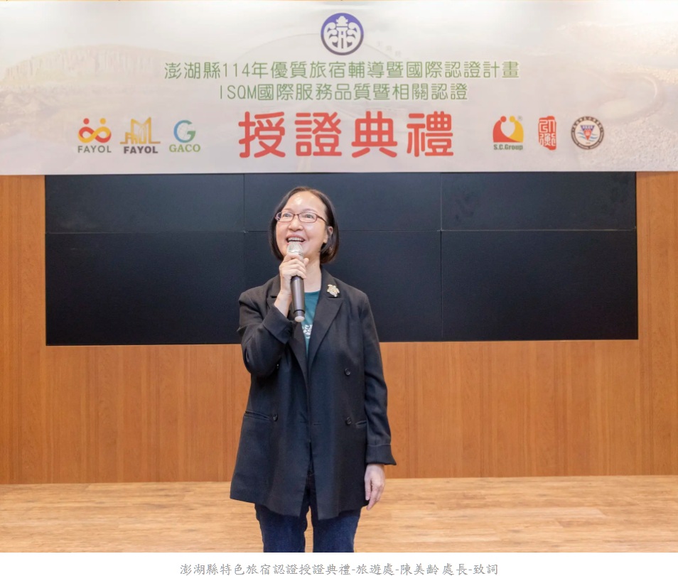 為深化在地旅宿品質並促進永續觀光發展,澎湖縣政府今(114)年持續推動「優質旅宿輔導暨國際認證計畫」,不僅提供多元認證項目供業者依經營特色申請,也對於累計取得5項(含)以上認證的旅宿業,授予「PGAA澎湖旅宿金質獎」(Penghu Gold Accommodation Award)之殊榮。日前於澎湖海洋地質公園中心舉辦授證暨頒獎典禮,旅遊處 陳美齡 處長親自頒發證書及獎項,有23家旅宿業者通過相關認證,共取得64張證書,其中更有6家旅宿業者持續精進服務實力獲頒「PGAA澎湖旅宿金質獎」,藉以表揚並肯定本縣旅宿業者的努力與創新。